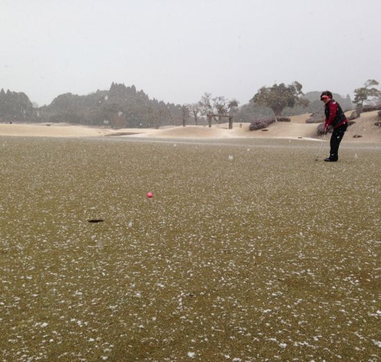 by kaneko投稿日: 2015年2月9日米原で雪ゴルフ 今日はこの冬一番の寒さだそうで。 そんな今日は久々千葉の米原でゴルフ~ 寒いくらいで中止出来るかっ! って言いながら、OUT6番から雪です。 アホかっ! グリーンもこんな感じ。 フェアウェイも真っ白♪ あ~楽しかった~。 風呂入って帰ります。