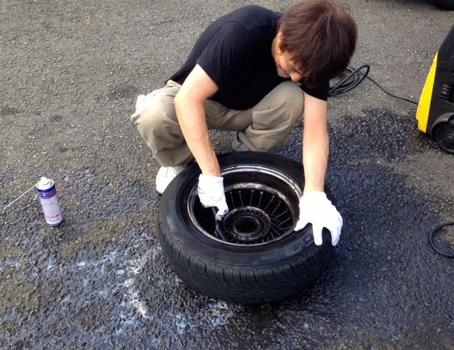 1本だけ綺麗になっちゃったんで後3本、MGBのオーナー自ら汚れたワイヤーホイールのクリーニング体験。