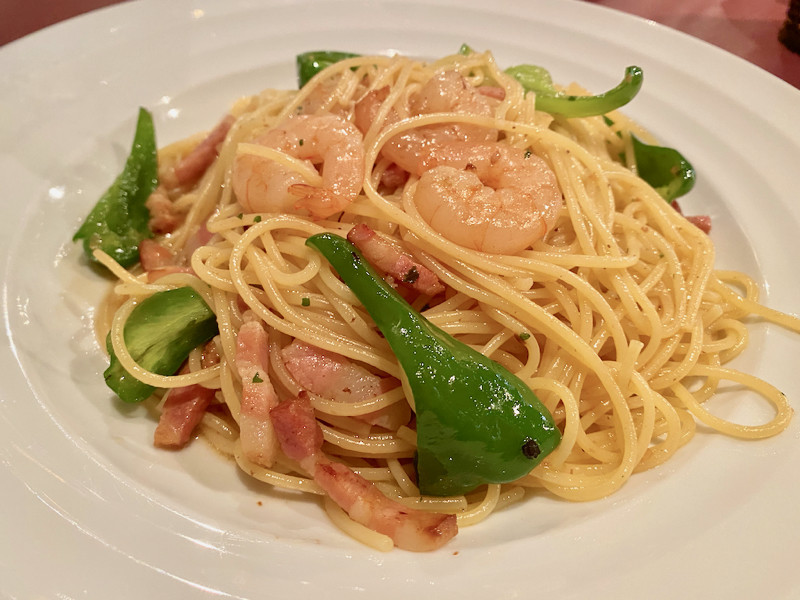 今日は海老とピーマンの和風パスタ。ちょい辛でお気に入りです。