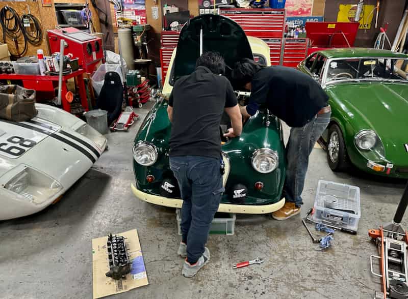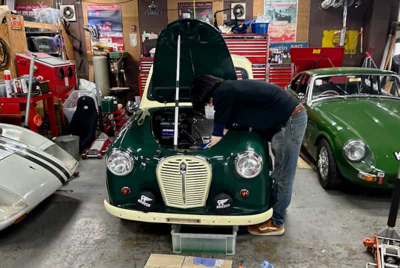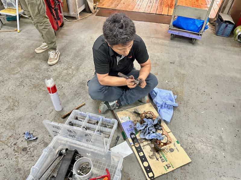 用事で昼から出社(笑)のつぐね、早速そのオースチンA35のシリンダーヘッド外し作業開始です。
