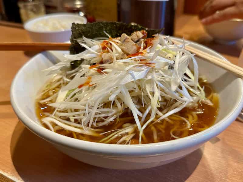ワタクシはいつもの醤油のネギラーメンに餃子4個です。