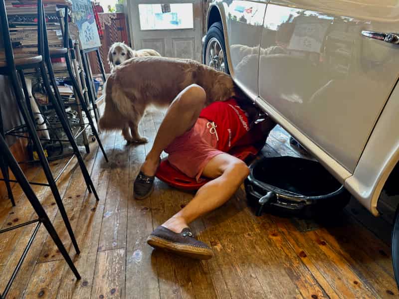 お預かりなんでまずはオイル交換からですが犬が邪魔です。