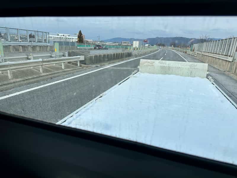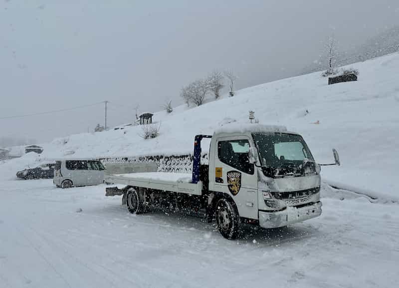 積載車の荷台の雪が笑える。
